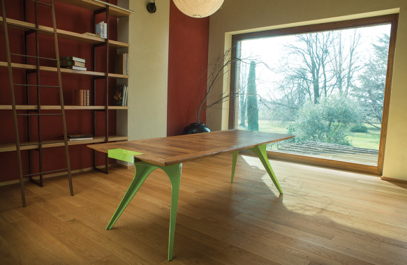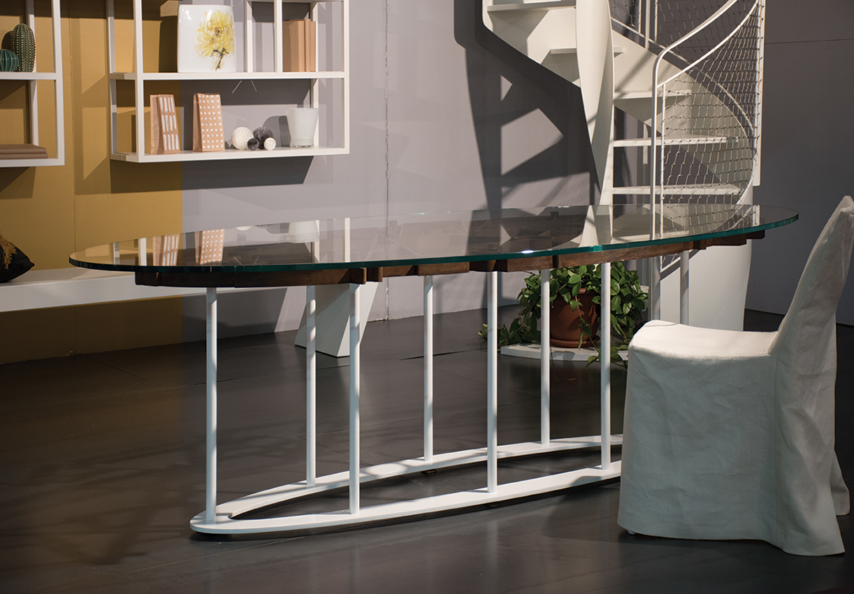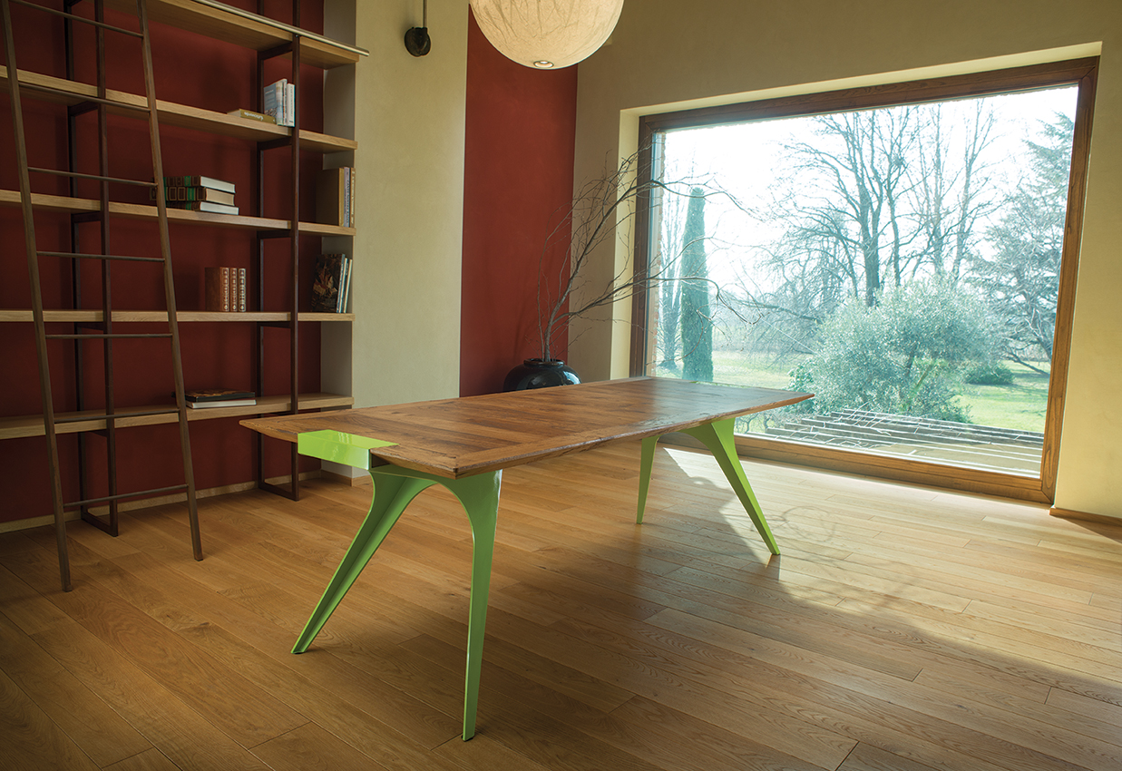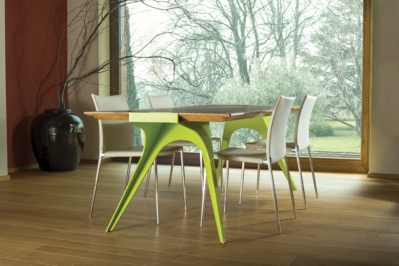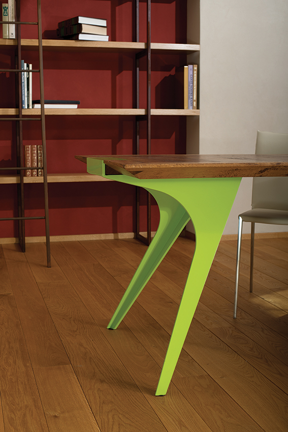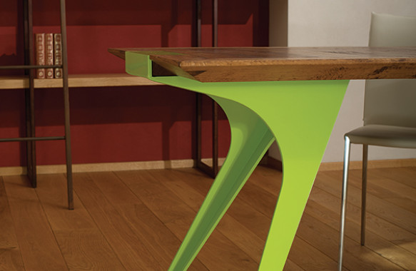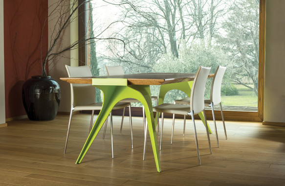 La vasta scelta di materiali e finiture per i componenti del tavolo offre una possibilità di personalizzazione unica sul mercato: ad un piano, realizzabile in vetro o in varie essenze lignee, si possono abbinare delle gambe dalle forme plastiche, trattate con lavorazioni tradizionali, come la verniciatura disponibile in tinta RAL a scelta, oppure realizzate con materiali particolari, come l’acciaio COR–TEN.